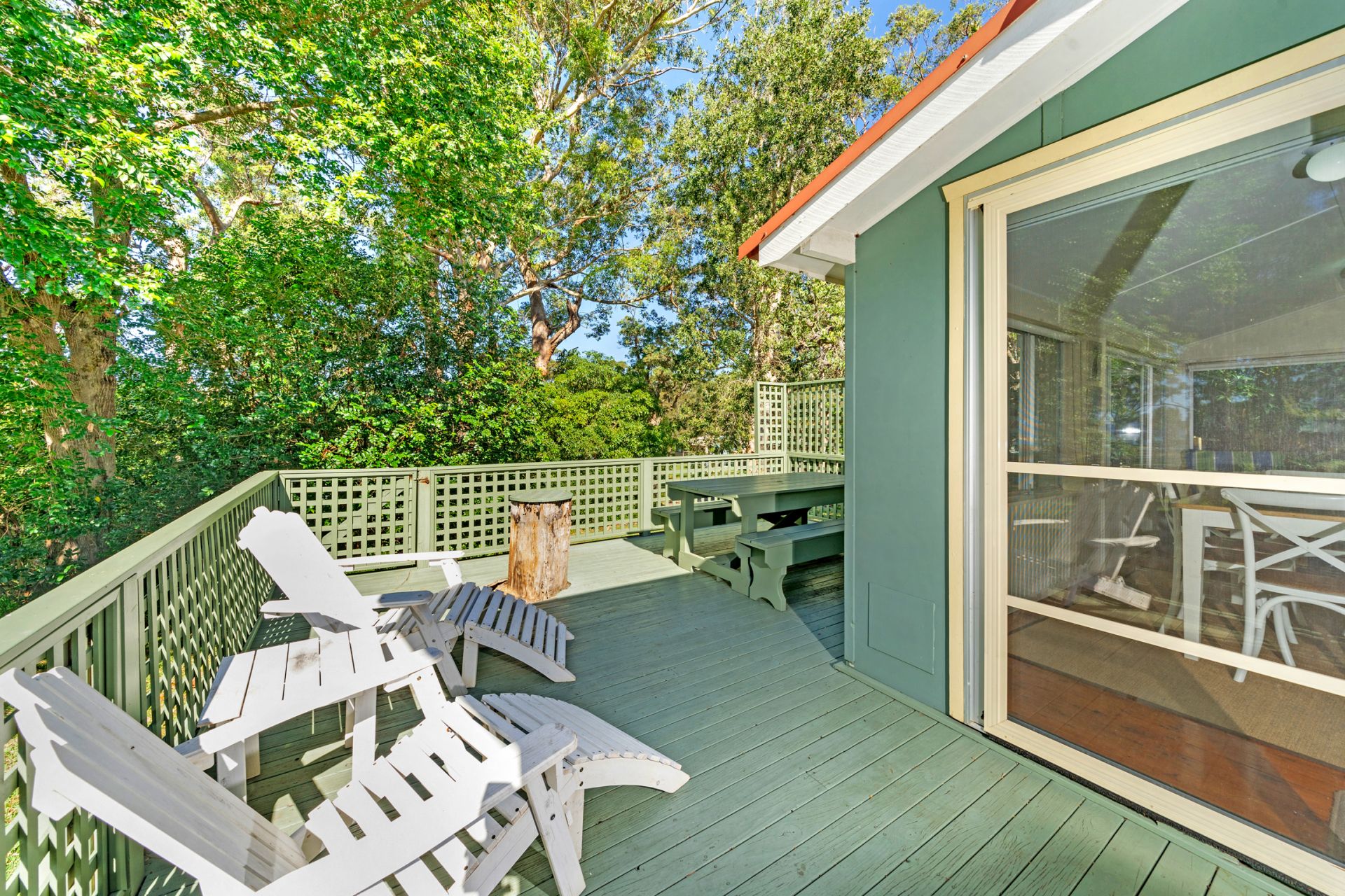 The property has side lane access with a garden area, parking bay, and bin bay, as well as a large timber deck leading to the front door.