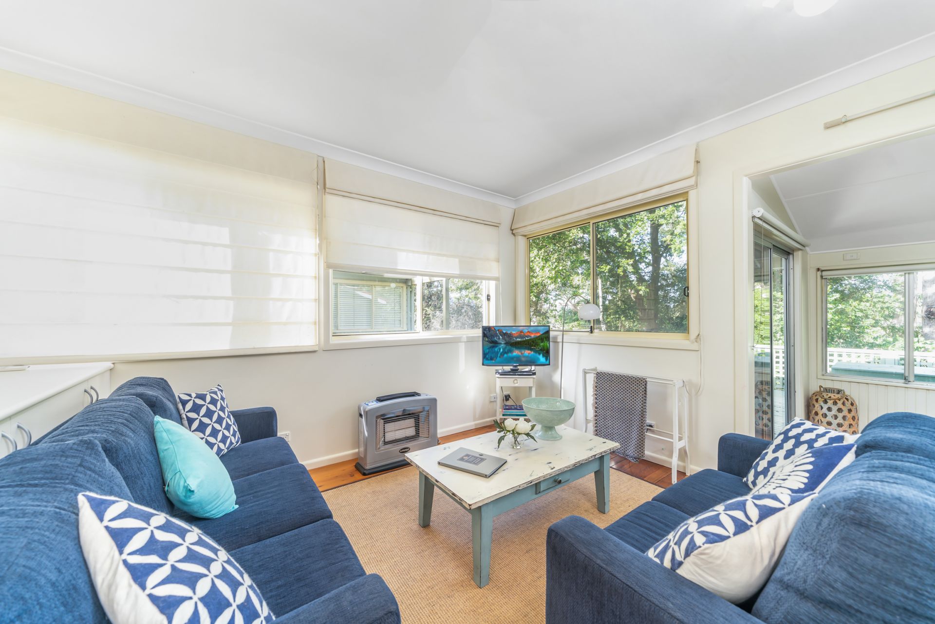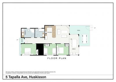 Tapalla Point is a single level home with three bedrooms (master with built in robes), an open plan kitchen and living area, a sunroom and internal laundry. There is also a lovely patio area under large, native trees, overlooking the Moona Moona estuary. The floor plan shows the exact layout of the house.